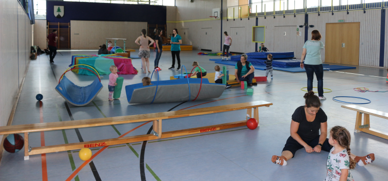 Beim Eltern-Kind-Turnen machen die Kleinen mit (Groß-)Eltern, Tanten oder Onkeln erste Bewegungserfahrungen beim Spielen und Turnen in der Halle. Hier krabbeln die Minis durch Tunnel, purzeln über dicke Matten, klettern über Kästen.